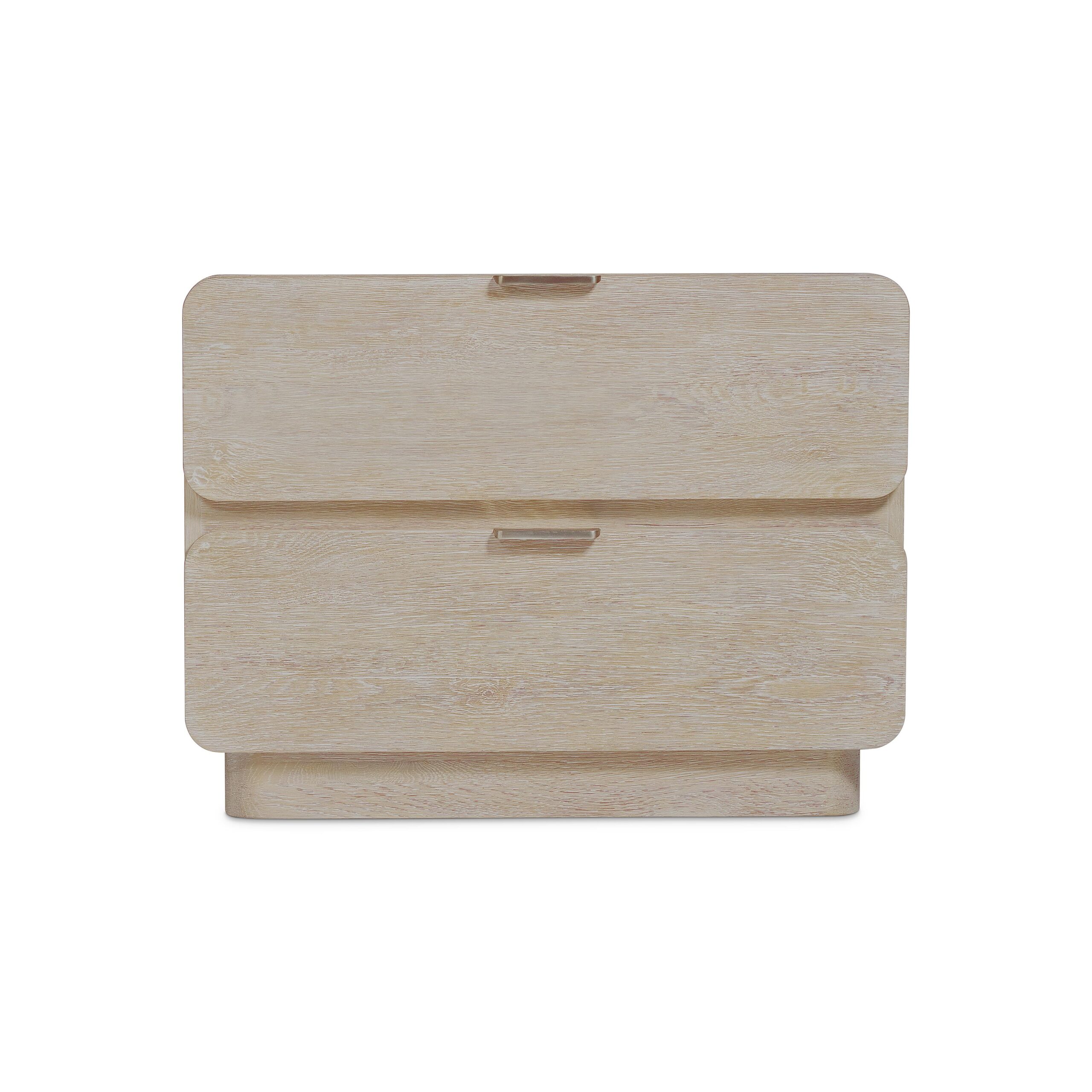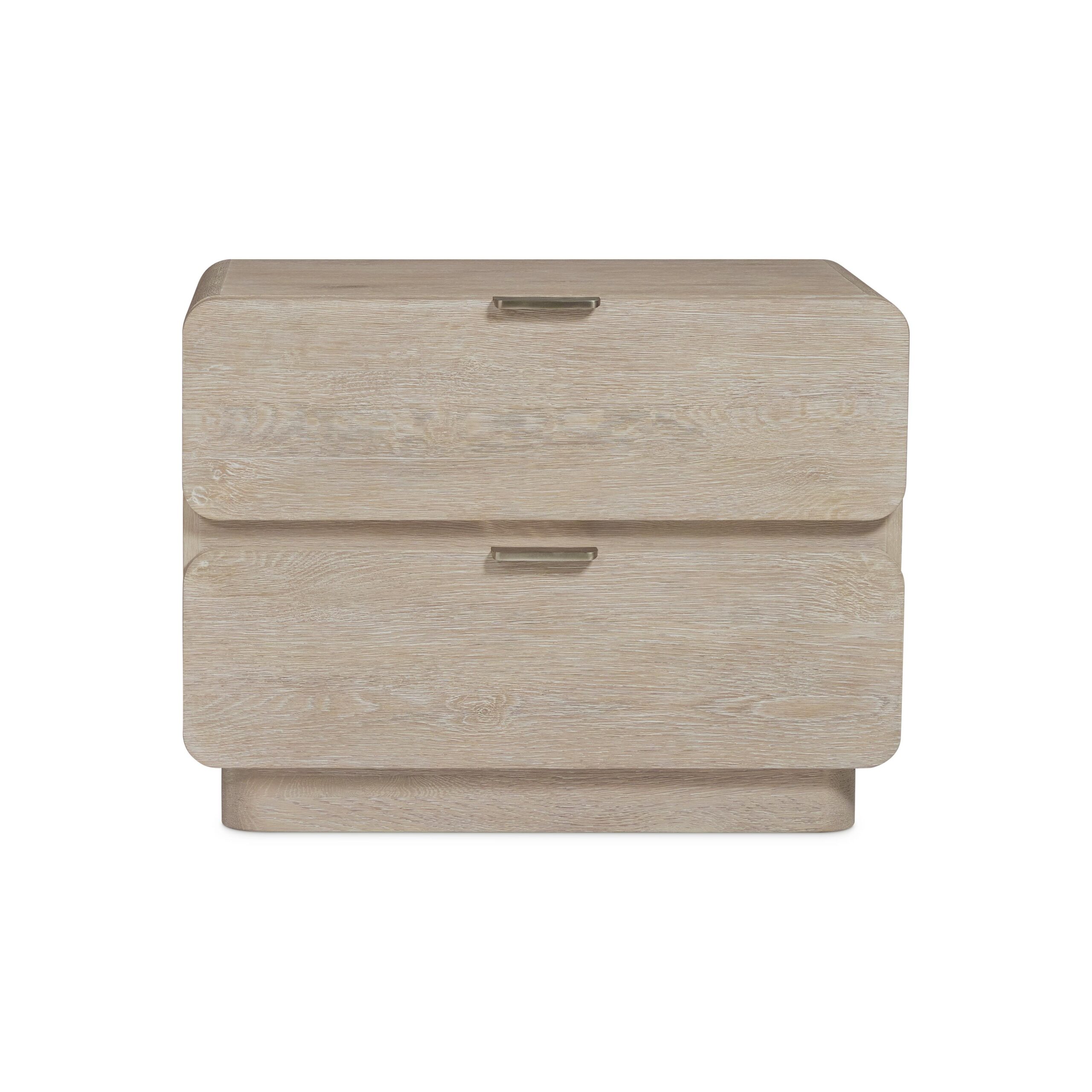 Elemental design gets a refined and modern update for the Antibes nightstand. Softened corners and shapely drawer fronts have an organic simplicity with the rustic Roz finish. The case is supported with a plinth base and features two pull-to-open drawers with cast aluminum pulls.