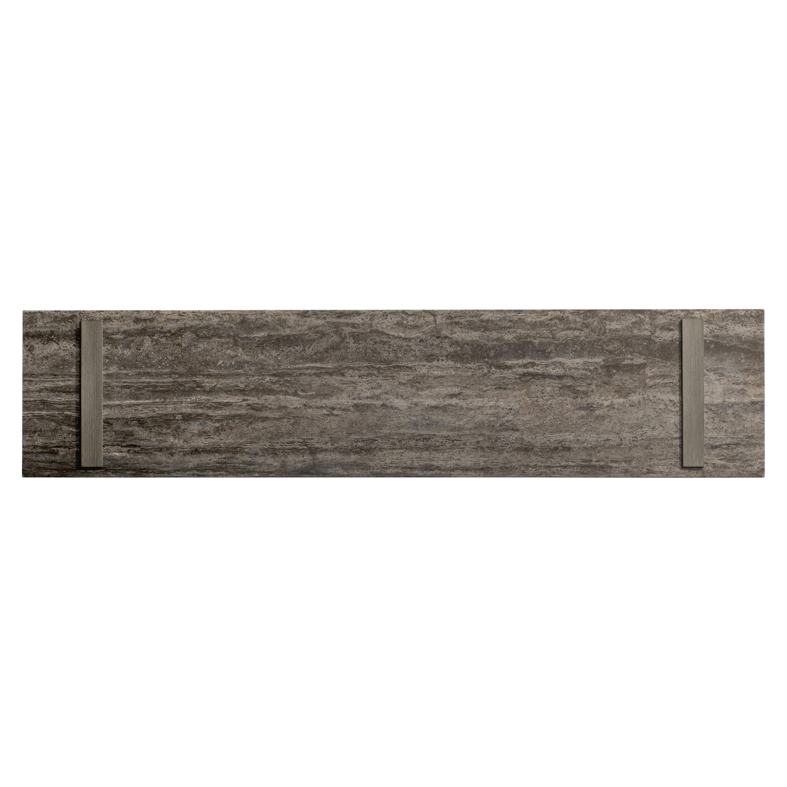 - Honed silver travertine table top, supported by base of oak solids and veneers in Weathered Greige finish