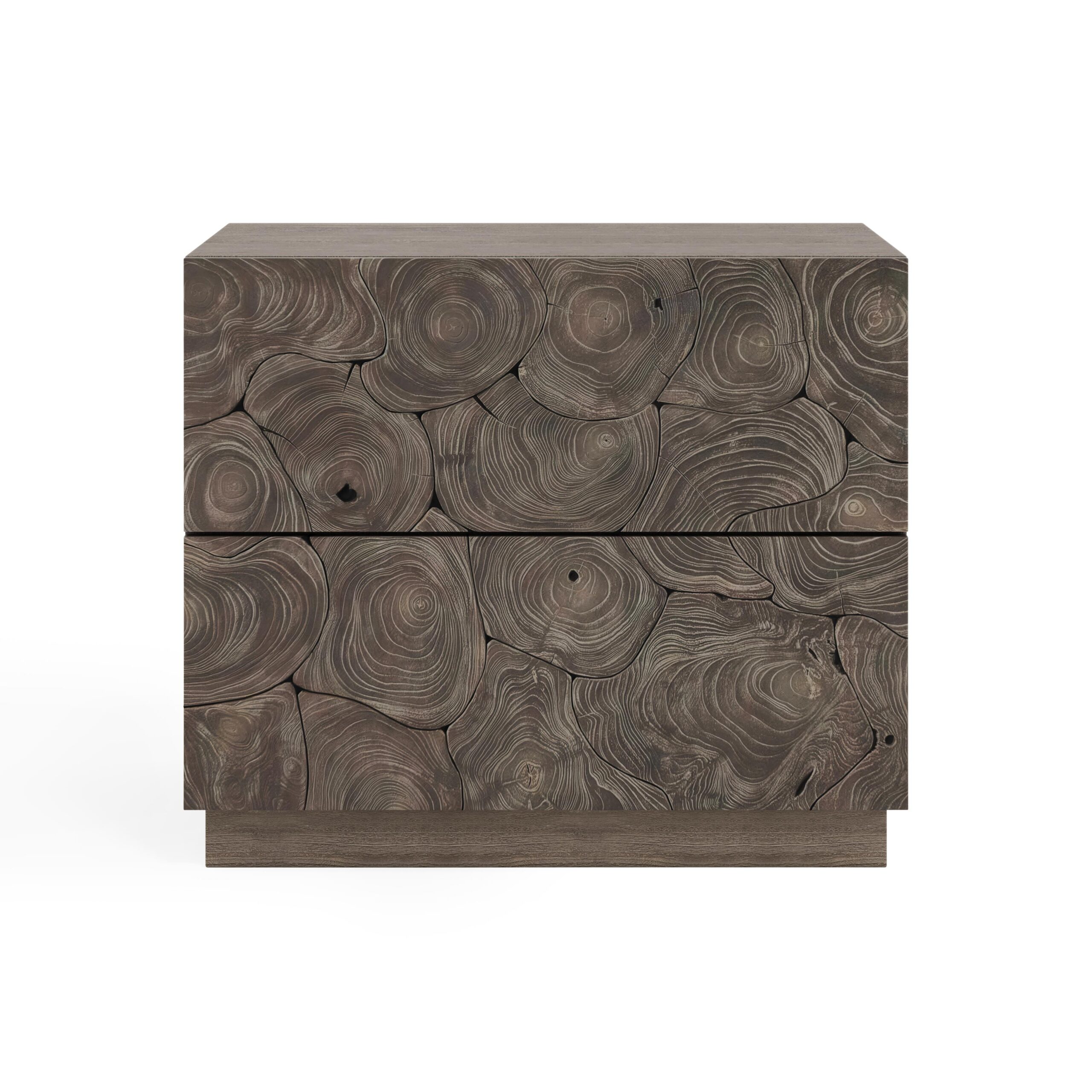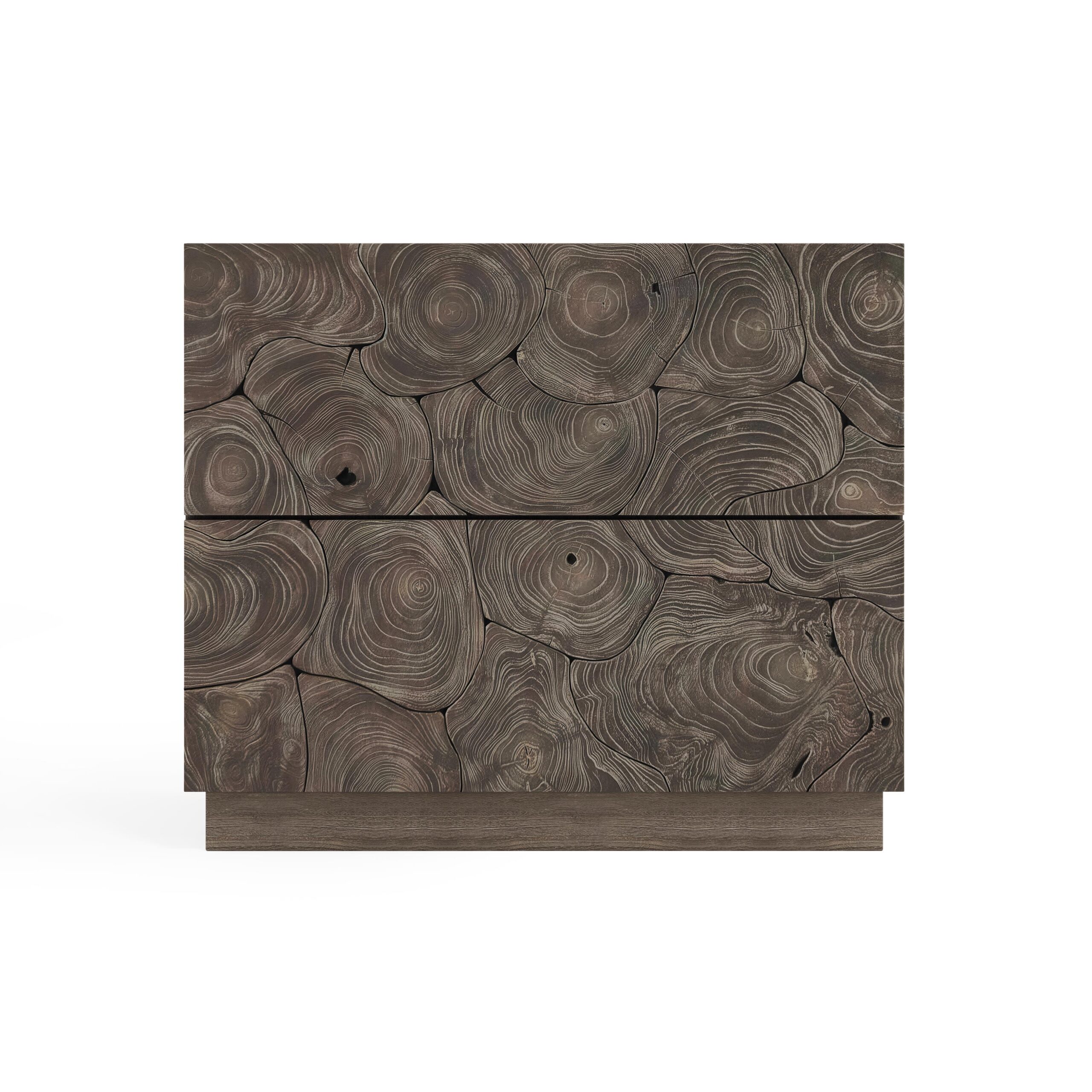 Slices of natural teak form a chic pattern on this stunning nightstand.