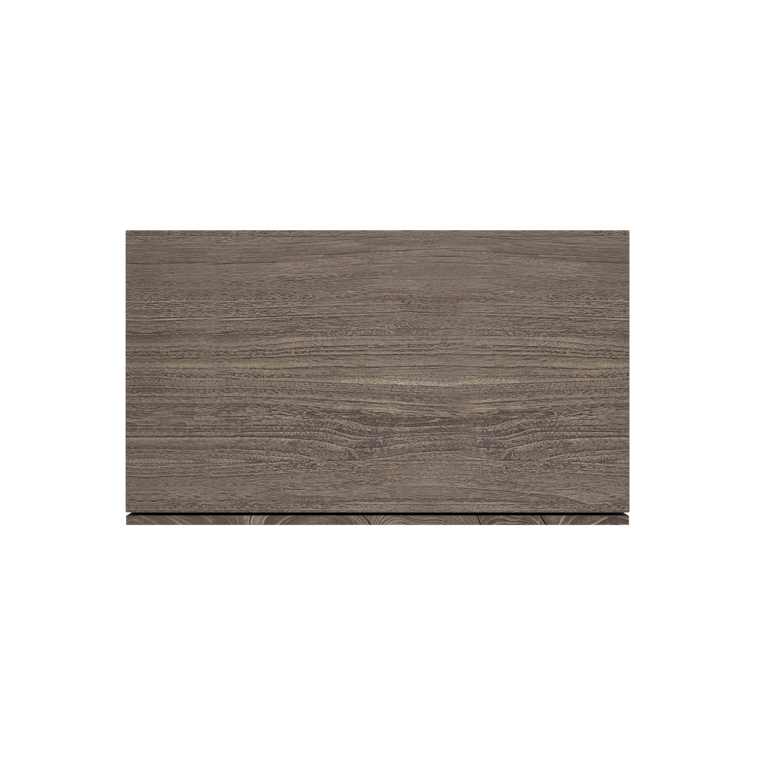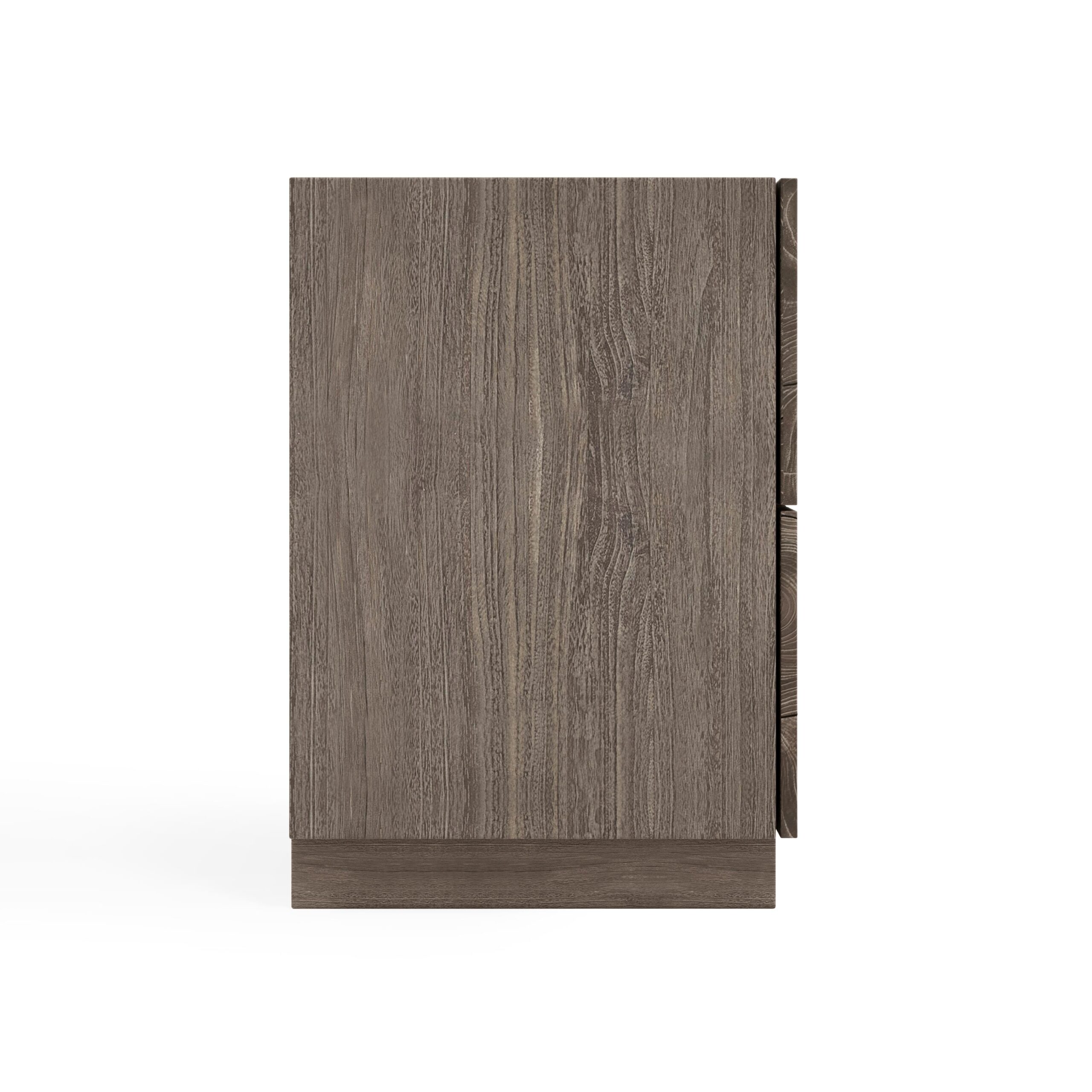 A simple minimalist form combines with the beautiful organic texture of teak for the Calavaras nightstand. The design draws all eyes, with its open-work pattern of sliced teak on two push-to-open drawers. Finished in Smoked Truffle, the nightstand rests on a plinth base.