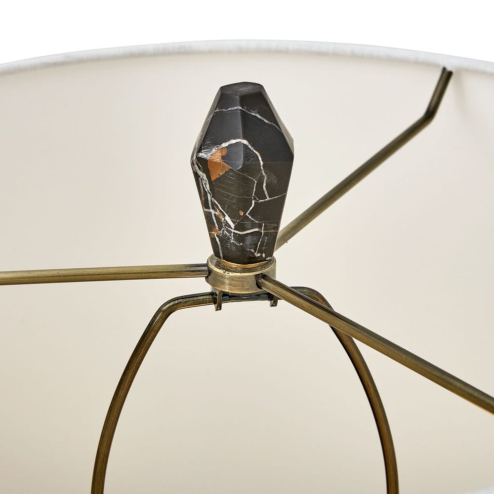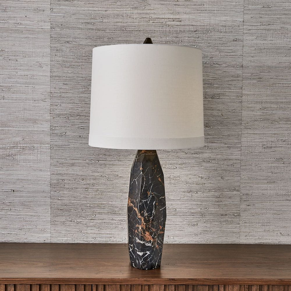 Faceted carved solid Michelangelo marble creates its own light show with gold and white veining throughout the body. Each will vary slightly, as will the asymmetrical silhouette. An elongated round tapered hardback shade plays the simple counterpoint, in white linen edged with wide self trim.