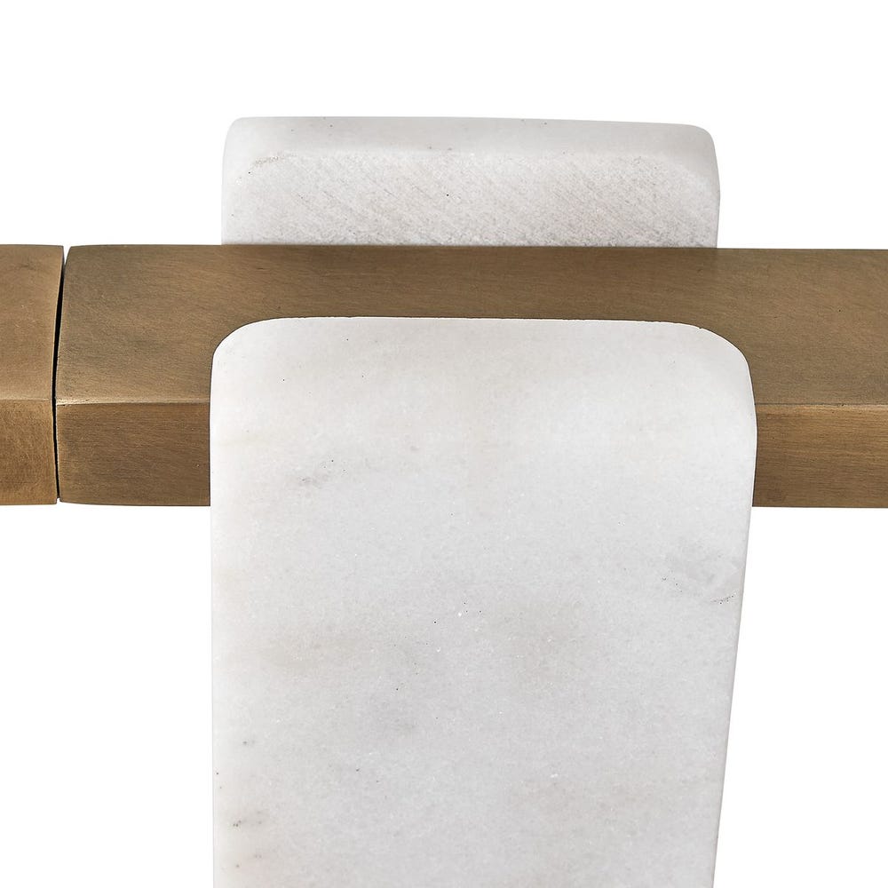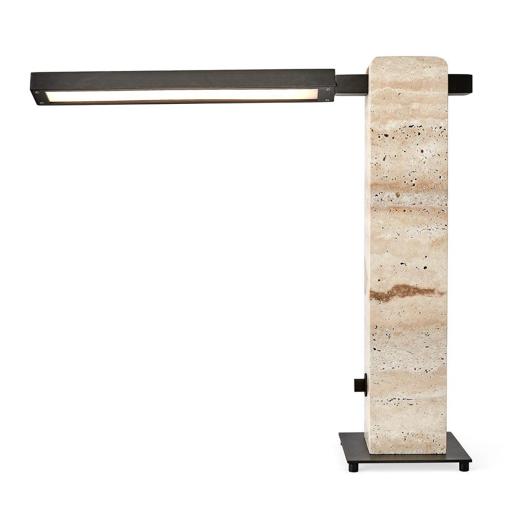 A slender metal arm with bronze finish rests on unfilled beige travertine to form this lamp scaled for desks or bedsides. The light gently pivots side-to-side for directional lighting. Below the dimmer, a square metal base keeps the footprint minimal. No bulb required; the integrated LED light system produces up to 50,000 hours of illumination.