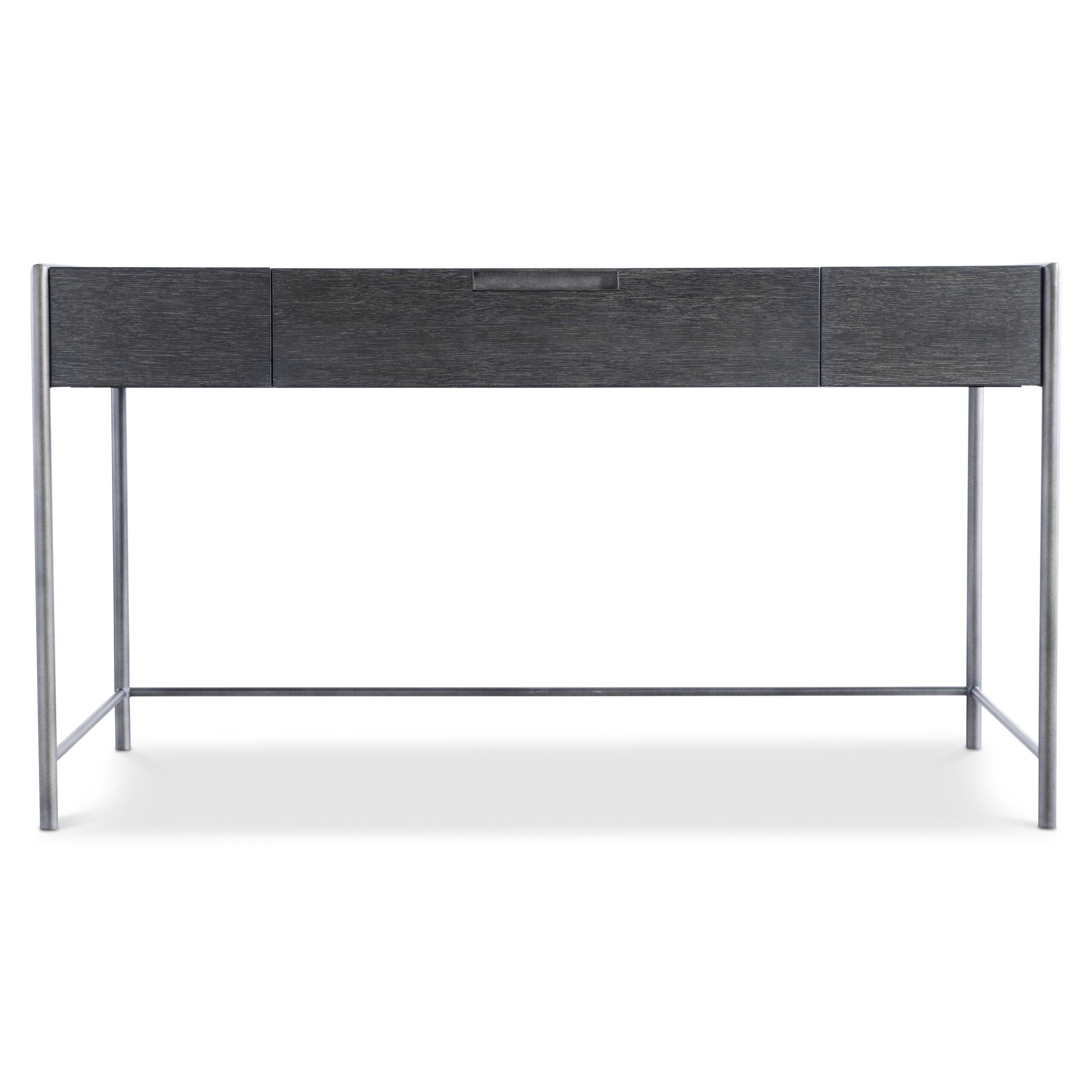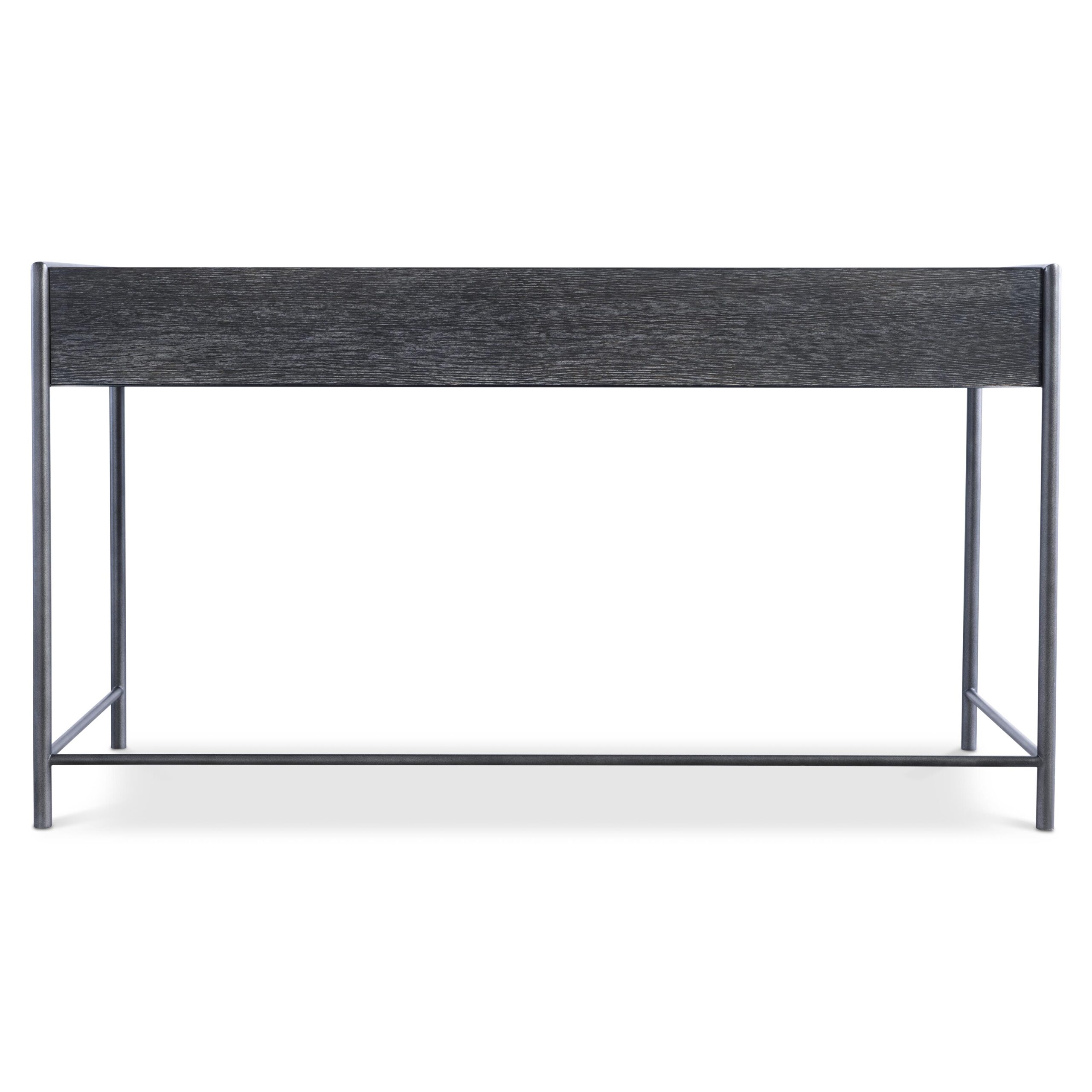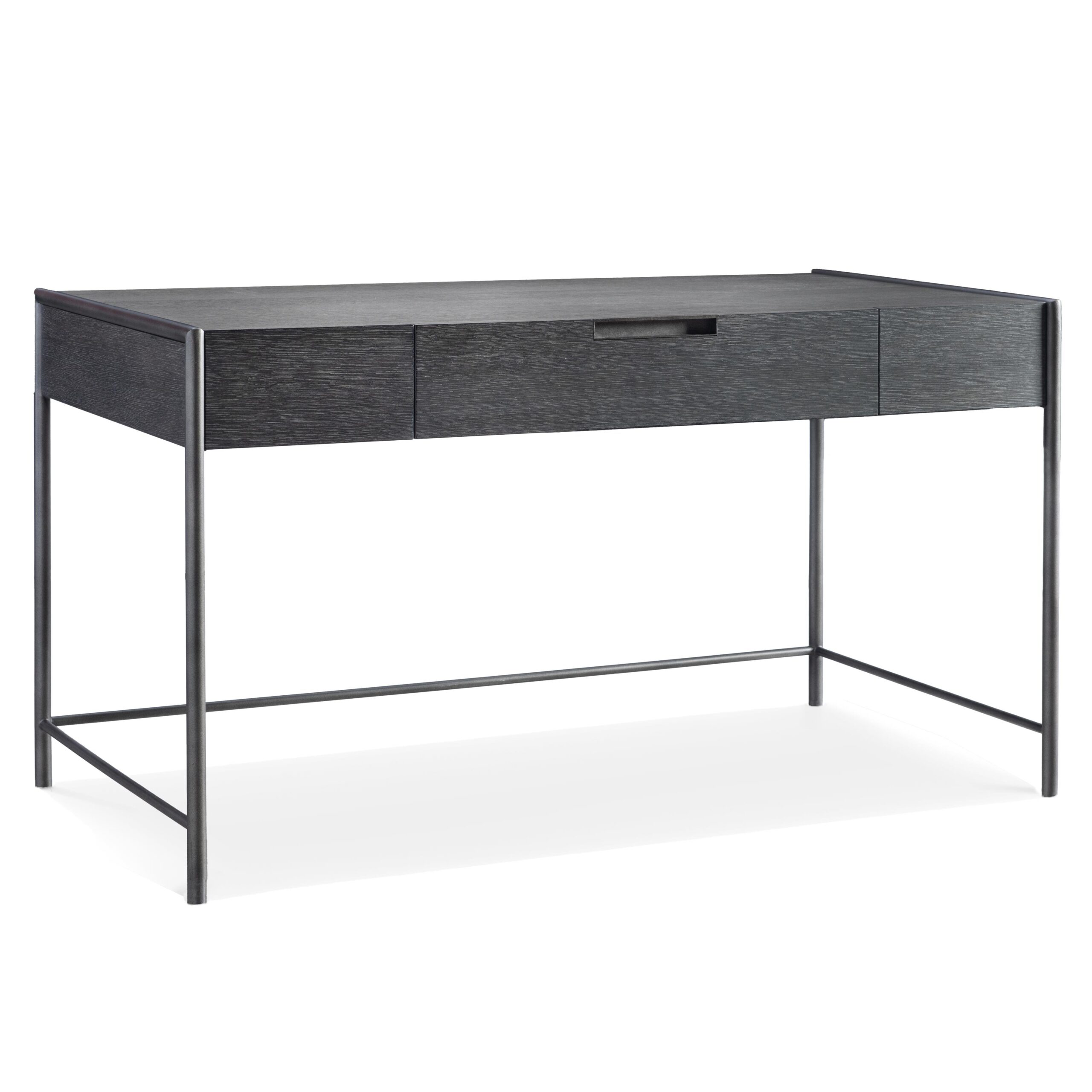 The Outline desk has a distinctive design featuring a metal frame that wraps around the wooden desk top. The metal finished in Atra extends to the floor to form sleek legs. The look is casual yet refined with a minimalist style.