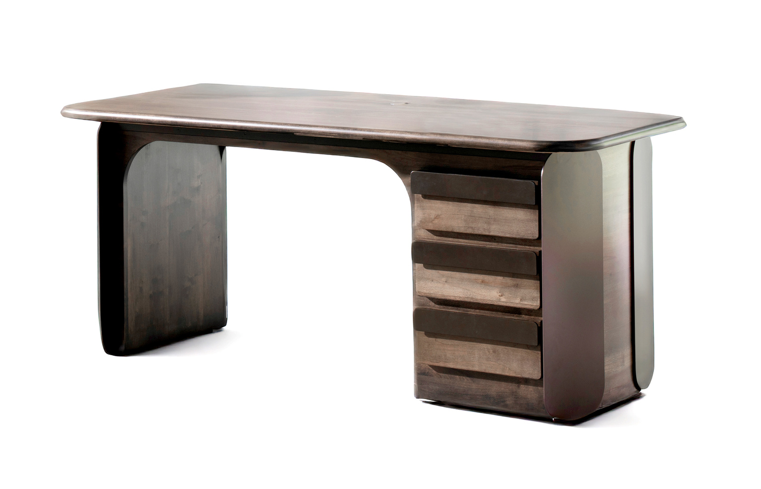 This handcrafted Desk features softly curved edges and metal accents that highlight its sculptural form. Available in your choice of ash, maple, or walnut, each piece showcases the beauty of natural wood paired with sleek metal detailing. Designed for today’s hospitality and contract spaces, the Paz Collection combines timeless materials with thoughtful design for a look that feels both modern and enduring.