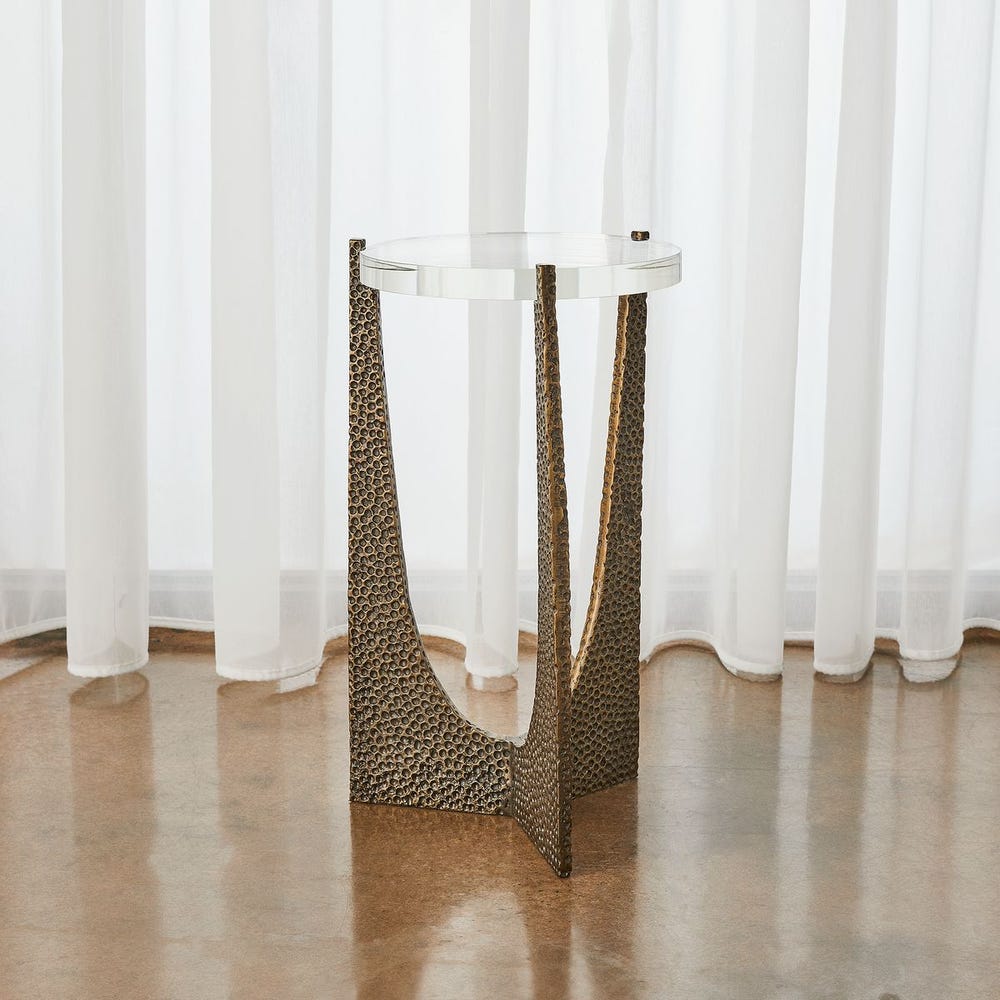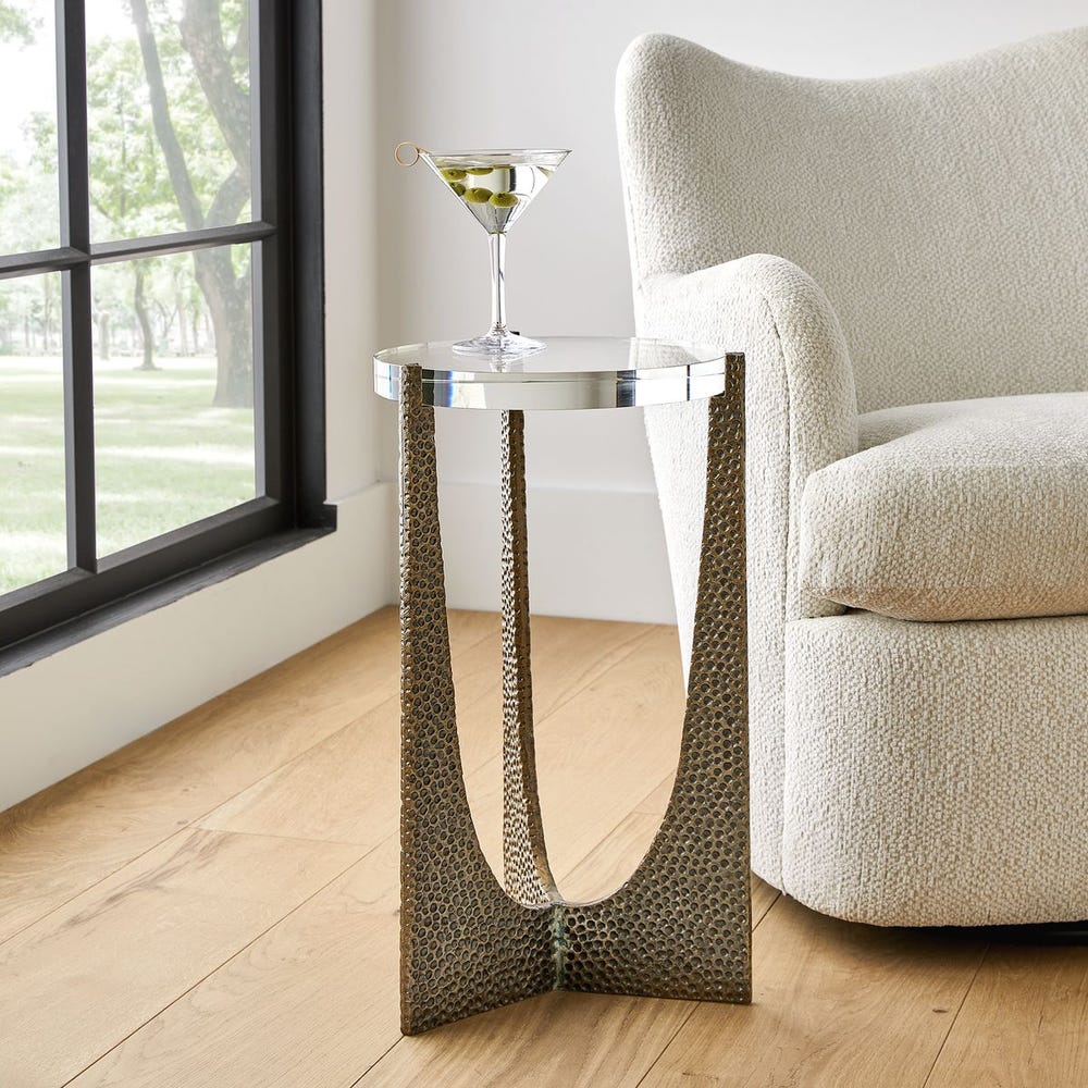 A thick crystal top is on display, secured with prongs like a diamond ring. The sleek, minimal-profile base is made of hammered steel, finished in a golden bronze.